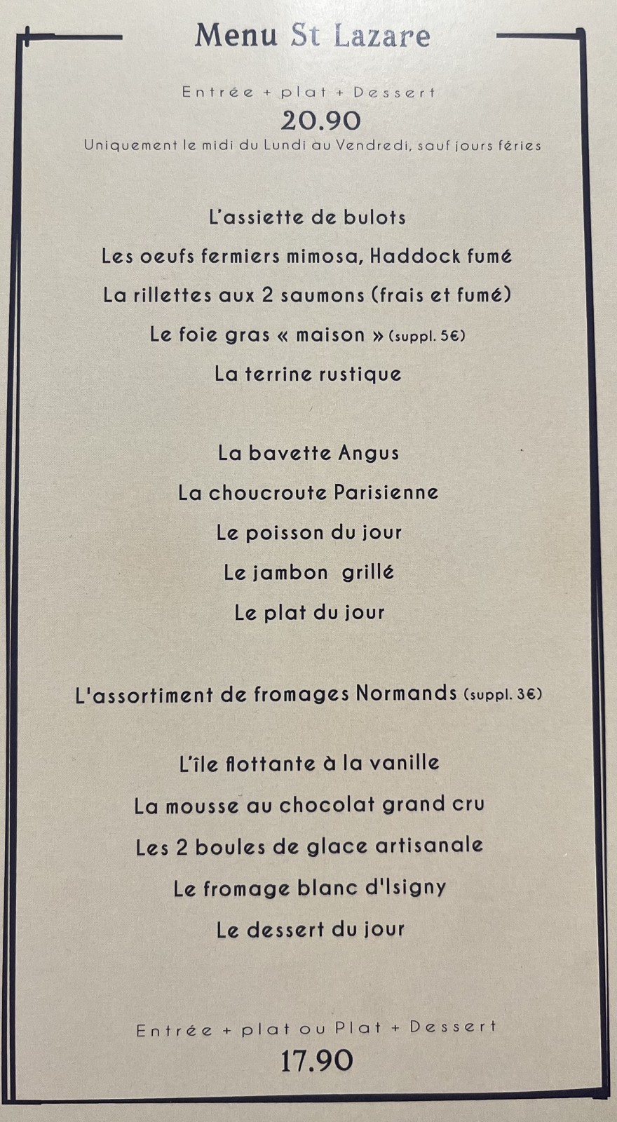 Venez découvrir notre menu St Lazare (uniquement le midi du lundi au vendredi, sauf jours férié)